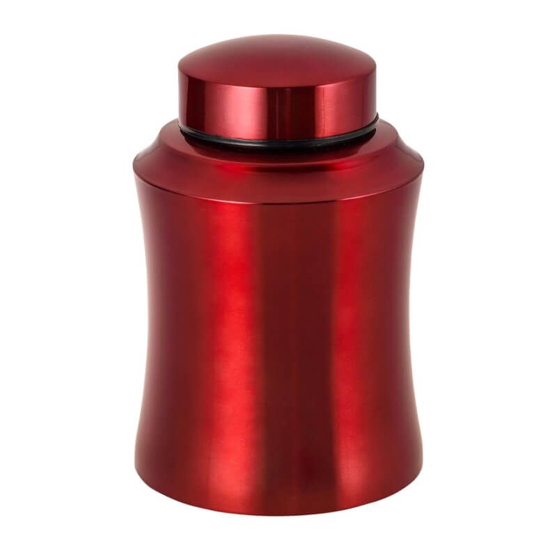 Lata cilíndrica roja de diseño moderno con cierre hermético de rosca, fabricada en acero inoxidable ideal para utilizar con productos alimenticios.